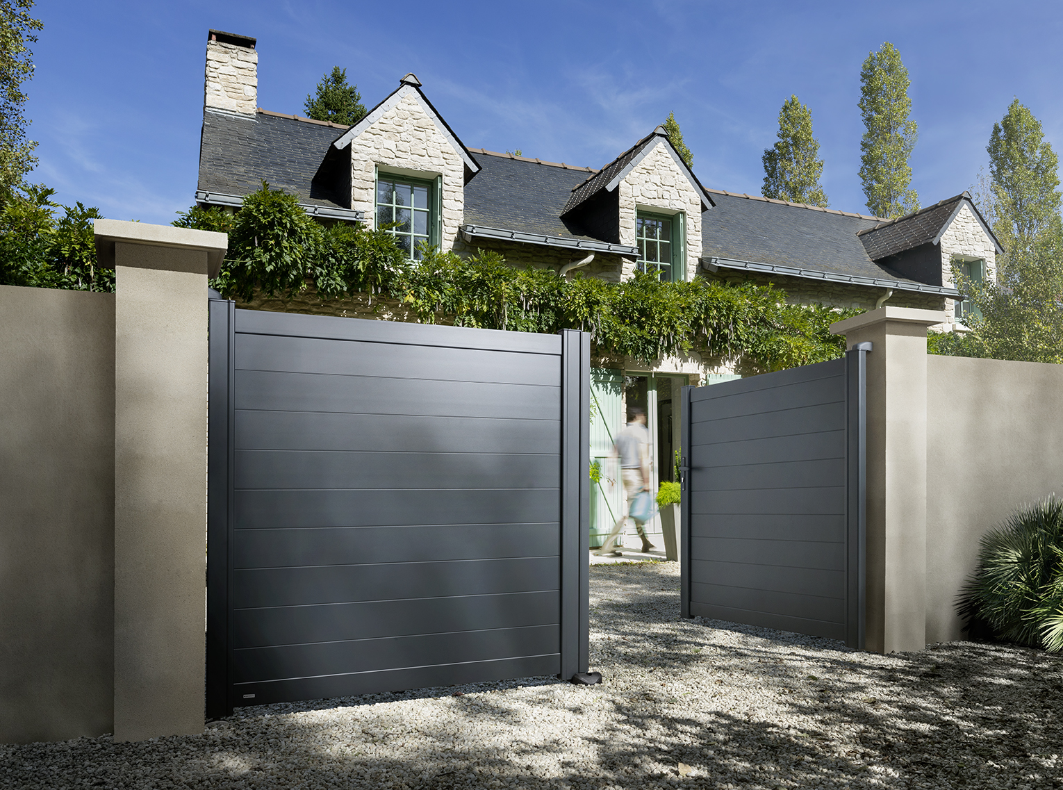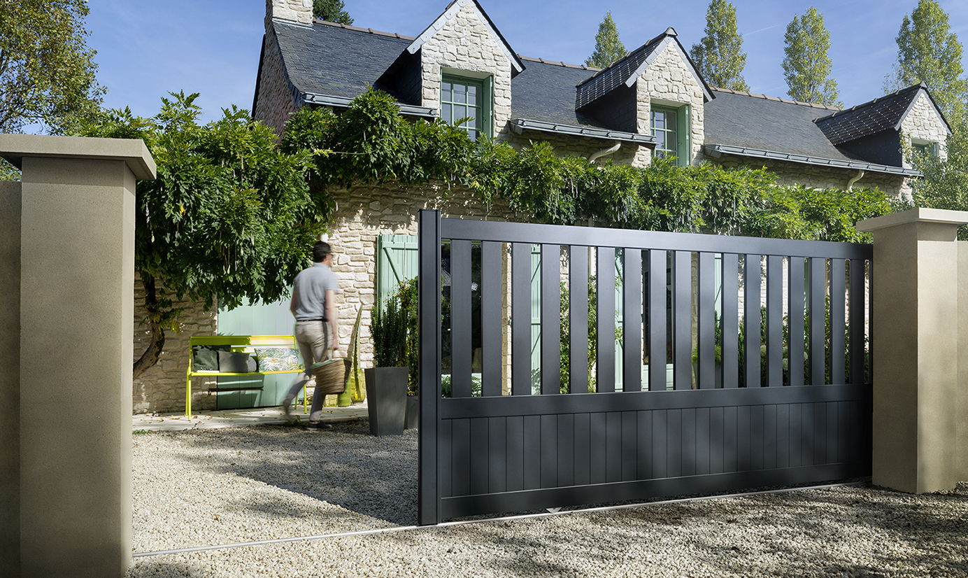 PENMARCH, un modelo semi-lleno de aluminio inspirado en los marcos de madera tradicionales, con lamas separadas de 90 mm en la parte superior y lamas compactas de 90 mm en la parte inferior. Creará un ambiente cálido en su jardín. Disponible en diferentes dimensiones (anchura y altura...).