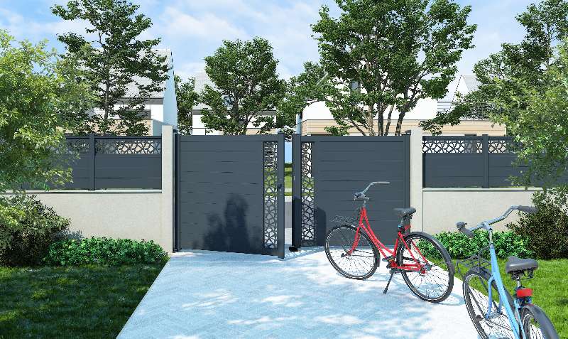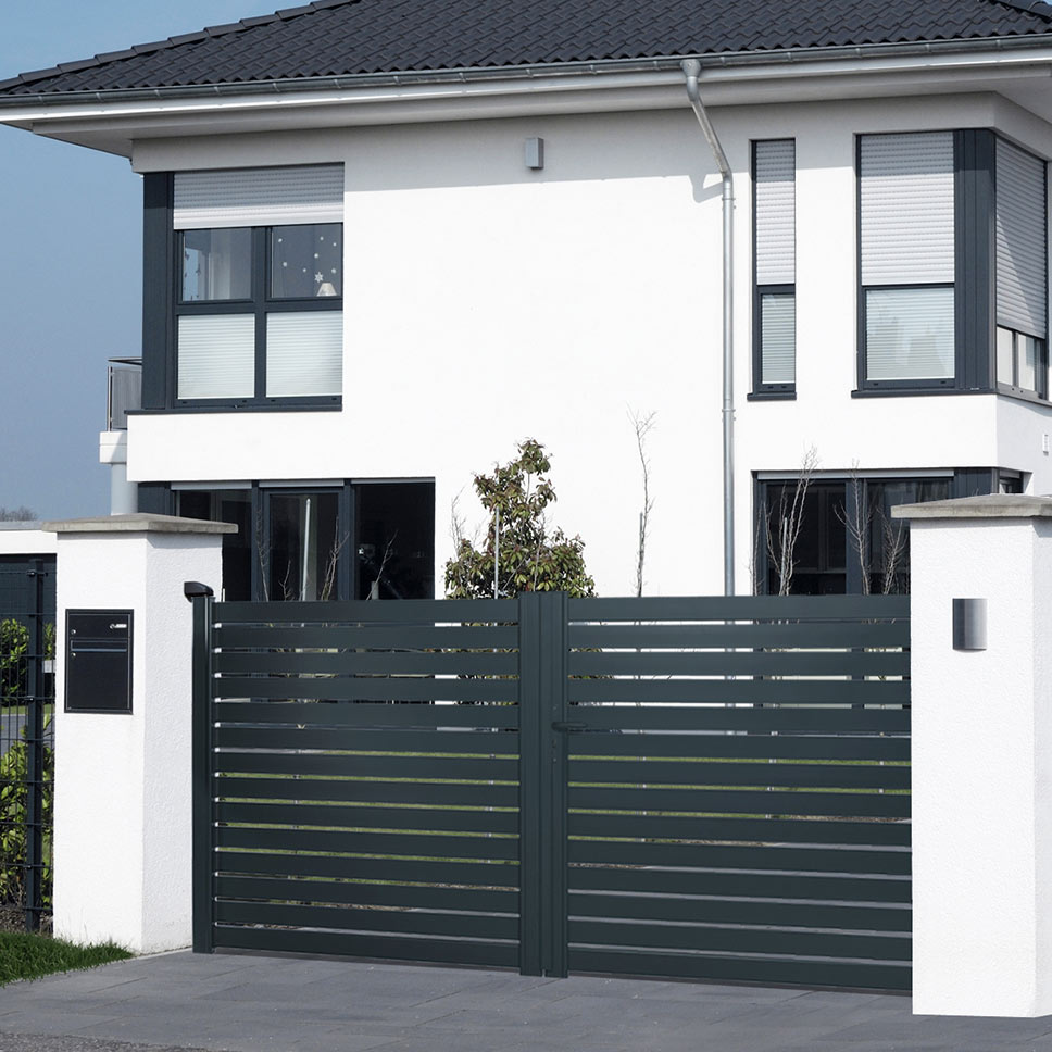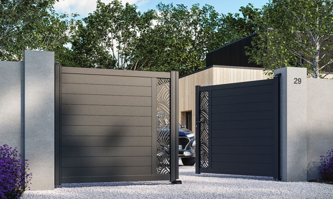 MIX IT, un modelo recto de aluminio macizo con lamas compactas de 150 mm y decoración de chapa cortada con láser. Su motivo decorativo horizontal o vertical aportará un toque de originalidad a su jardín. Disponible en diferentes anchuras y alturas.